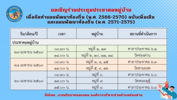 ขอเชิญชวนประชาชนเข้าร่วม “ประชุมประชาคมหมู่บ้าน” เพื่อร่วมแสดงความคิดเห็นและจัดทำแผนพัฒนาท้องถิ่น