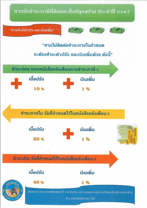 กำหนดการชำระภาษีที่ดินและสิ่งปลูกสร้าง ประจำปี 2567 ภายในวันที่ 30 มิถุนายน 2567 สอบถามรายละเอียดเพิ่มเติมได้ที่ งานจัดเก็บภาษี กองคลัง องค์การบริหารส่วนตำบลช่องด่าน โทร 034-603859 , 034-603815 ต่อ 105